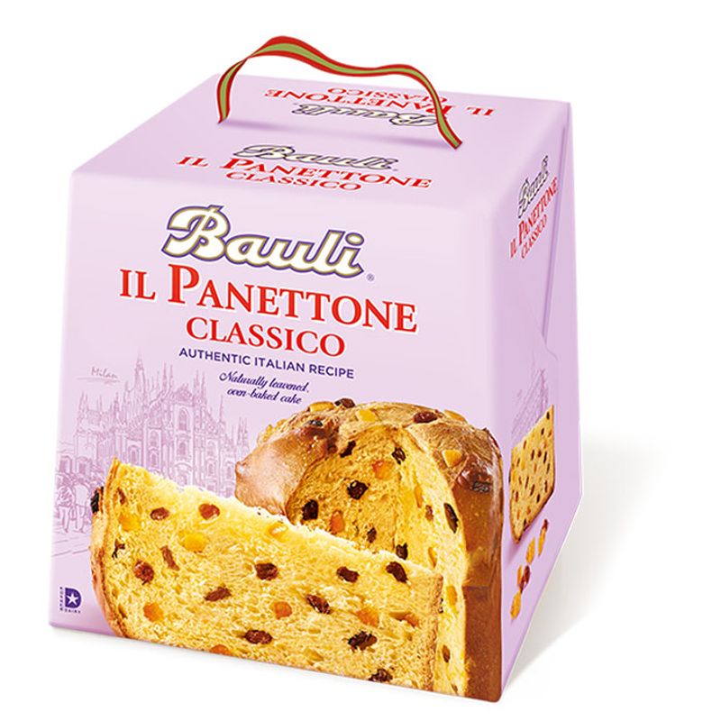 Bauli Panettone is a light-textured spiced cake containing sultanas and candied fruit.