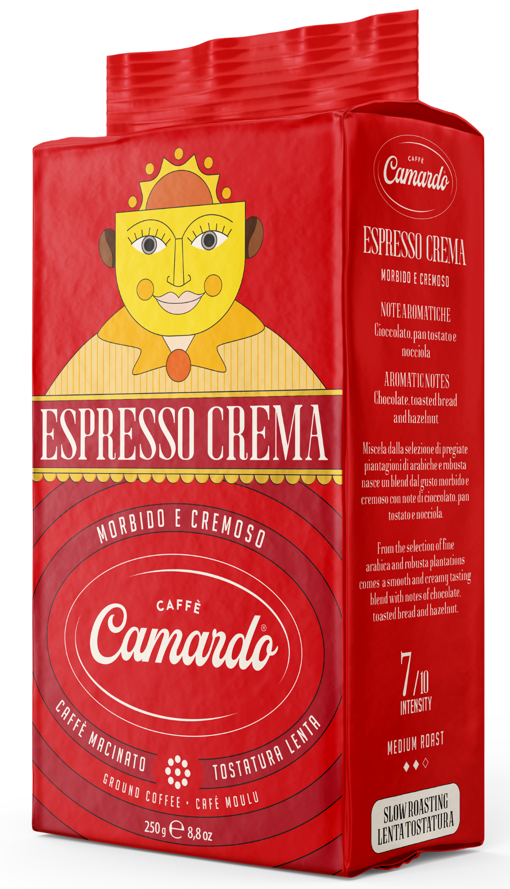 Caffè Camardo carefully selects and blends the best high-quality coffee beans to produce a authentic Italian strong and refined coffee. Camardo Espresso Crema coffee beans are blended with premium Arabica and Robusta coffee beans from India, Central and South America for that long-lasting crema.