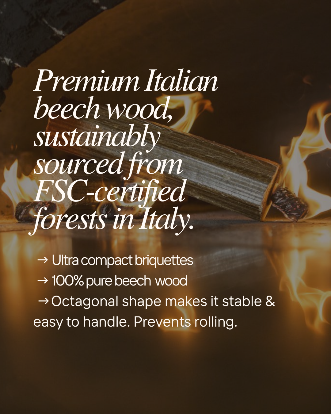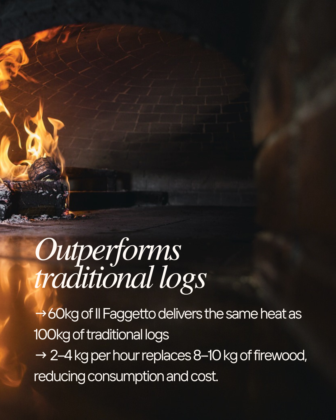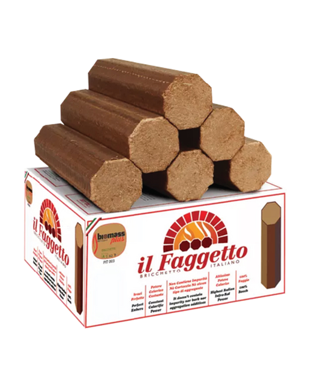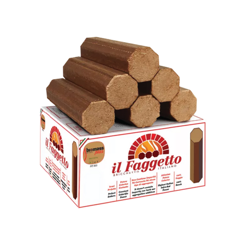 In general, Il Faggetto Wood Briquettes will outperform traditional wood logs in terms of consumption and cost. They will allow for a delicious crisp pizza base, signature leoparding on the crust and no heavy smoke residue to overpower flavour. They are also ideal for rotisseries, grilling and BBQ's. Even suitable for fireplaces and fire pits. Their octagonal shape makes them easy to handle and stable.
