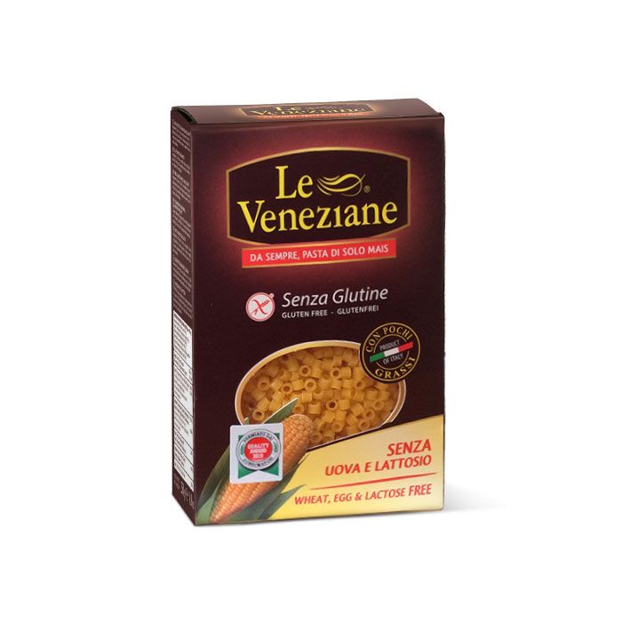 Le Veneziane Gluten Free Ditalini Pasta is produced using only the finest and top quality corn flour, which gives it the golden yellow colour from the natural carotenes (provitamin A). These natural properties make a plate of Le Veneziane Gluten-Free Pasta easily digestible and delicious!