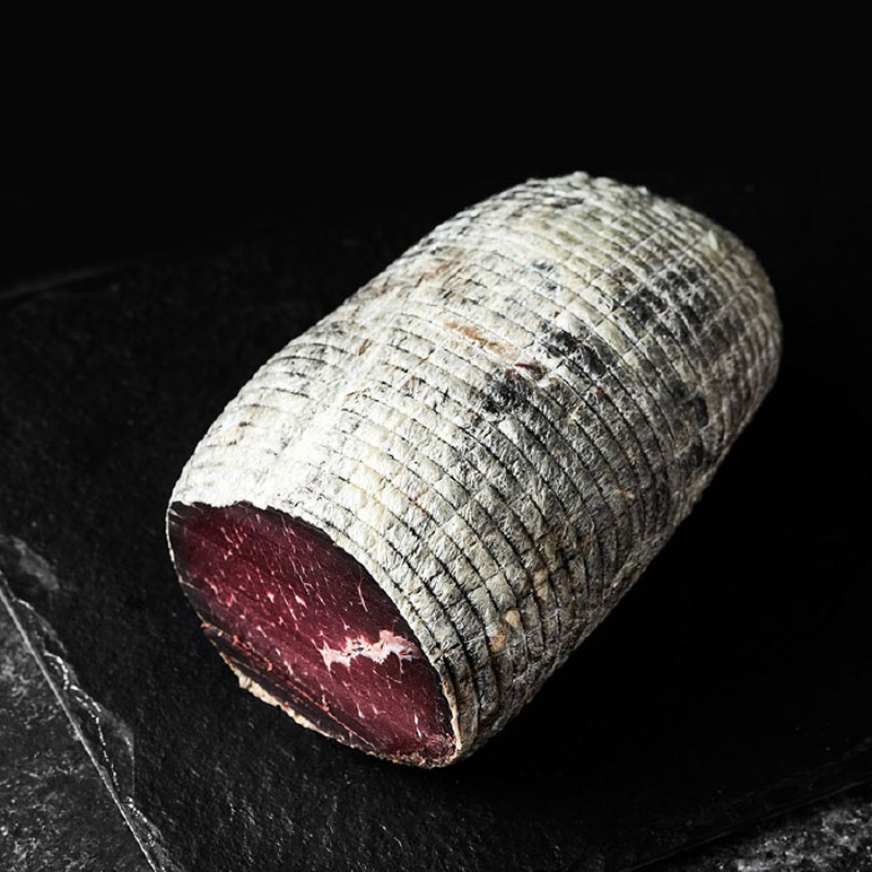 Bresaola Valtellina is air-dried, salted beef that has been aged for 2 to 3 months until it becomes hard and turns a dark red, almost purple in colour. It is lean and tender, with a sweet and musty smell.