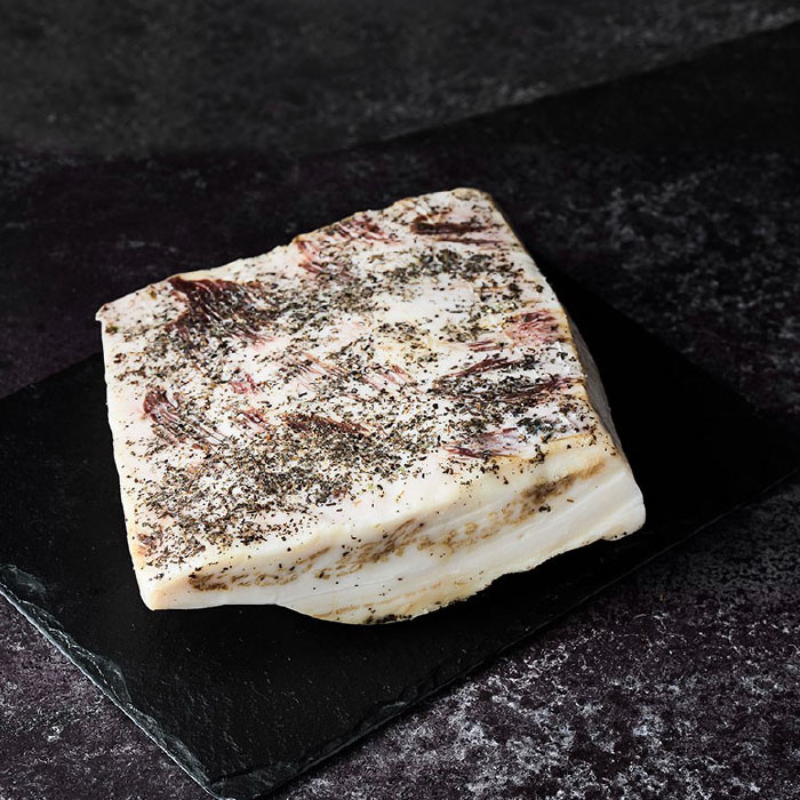 Lardo Tipo Colonnata is a piece of thick selected back fat and it originates from the region of Colonnata Italy. It is covered with fresh herbs and spices then cured for 3 to 6 months.