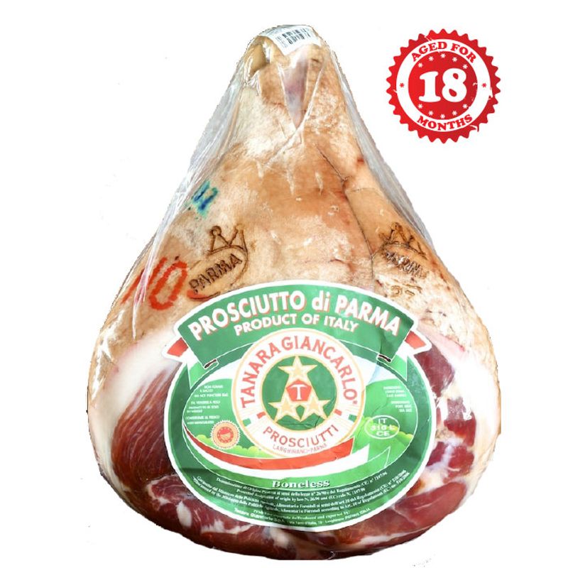 Each ham is fire branded with the four-pointed Parma Crown, certifying it as authentic Prosciutto di Parma.