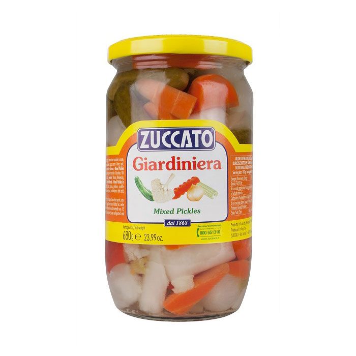 Giardiniera mixed pickles are made using the finest quality vegetables in particular carrots, celery, onions and gherkins. All the chopping and preserving is already done all you need to do is add it to other vegetable or rice salads. This variety is lightly salted to allow each vegetable to shine.